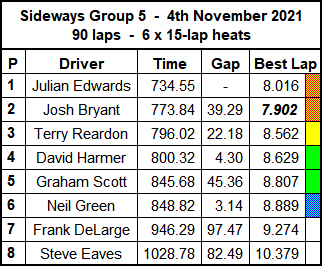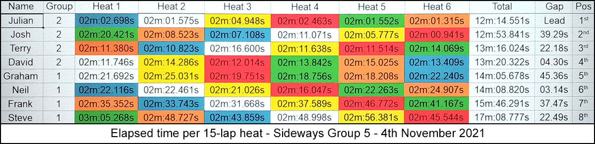 The race for the win might have been a walkover, but those for third and fifth were anything but. Fighting over third were Terry and David, Terry initially ahead until David took a 0.76 second lead at half distance, only to throw it away again with crashes in the late heats to finish half a lap down.